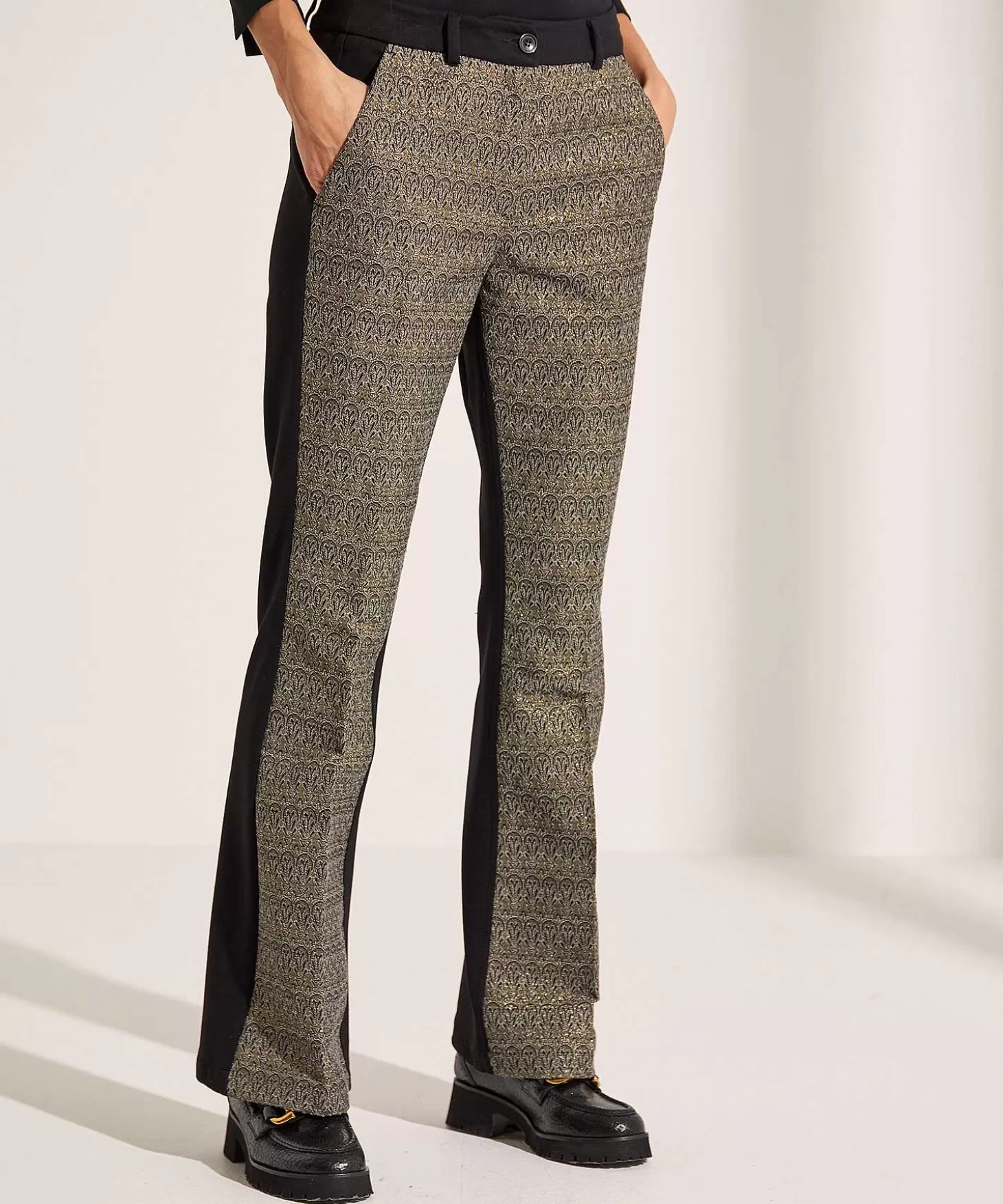 Zowel Feestelijk Als Chique. Met Deze Flared Pantalon Uit De Collectie Van Summum Kom Je Stralend Voor De Dag. De Uitvoering In Punto Milano Stof (Jersey) Is Uitgewerkte In Een Ingeweven Patroon Met Gouddraad. Op Het Achterbeen En Deels Doorlopend Op Het Voorbeen, Heeft De Broek Zwarte Rekbare Jersey. Combineer Deze Flared Met Een Aangesloten Kanten Top Of Kies Voor Een Glanzend Satijnen Shirt. Bij De Broek Is Een Blazer Beschikbaar In Exact Dezelfde Print. Creëer Daarmee Een Pak En Haal Dan Je Hoge Hakken Uit De Kast Om Je Look Oogverblindend Af Te Maken. De Broek Heeft Een Vaste Tailleband Met Rits- En Knoopsluiting. Aan De Voorzijde Zitten Twee Steekzakken En Aan De Achterzijde Twee Fake Paspelzakken. Samenstelling: 63% Katoen, 34% Polyester, 3% Metaalgaren. Contraststof: 60% Viscose, 35% Polyamide, 5% Elastan. Voering: 96% Polyester, 4% Elastan.