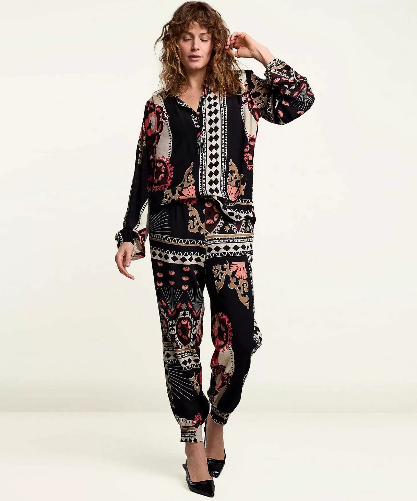 In Luchtige Crêpe Met Multiprint Wordt Deze Summum Broek Jouw Zomerse Favoriet. Zie Je Haar ‘Scarfprint’ In Natuurlijk Kleurpalet? In Offwhite, Donkerzand, Licht En Donker Koraal En Zwart Past Dit Relaxte Model Bij Veel Uit Jouw Garderobe. Naast Een Elastische Tailleband Heeft Ze Steekzakken, Bandplooien En Een Smalle Deels Gesmockte Zoom Boven De Enkel. Je Draagt Haar Met De Matching Voile Blouse En High Heels Op Een Party, Maar Ook Met Een Uni Top, Knitwear Of Een T-Shirt Ben Je Klaar Voor Verre Oorden, Hoge Temperaturen En Urenlang Slenteren In Stijl. Samenstelling: 100% Viscose.