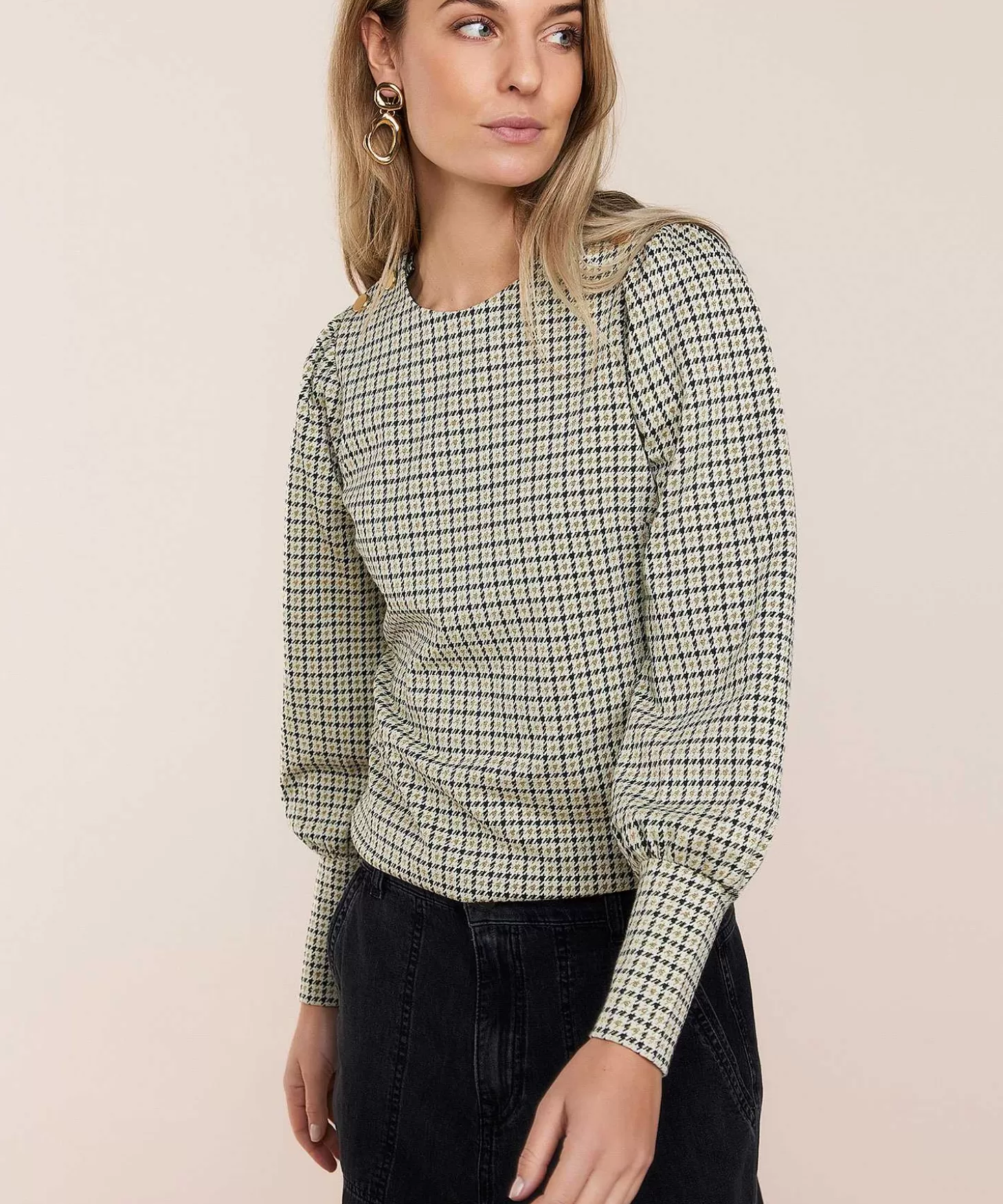 Preppy Meets Cool Met Deze Summum Top In Pied- De-Poule Ruitje Met Lurex. Wat Een Feminien En Relaxt Model Met Haar Ronde Hals, Goudkleurige Knoopjes En Pofmouw Met Slank Manchet. In Een Verder Recht Model Draagt Ze Net Zo Geweldig Als Ze Oogt En Haar Neutrale Kleurpalet Maakt Hare Een Ware Multimatcher. Draag Haar Met De Matching Summum Flared Broek Pied-De-Poule Lurex + Loafers Voor Een Klassieke Officelook. Naar Een Feestje Combineer Je Haar Met Een Pantalon Of Vegan Leren Broek + High Heels. En Wat Dacht Je Van Samen Met Een Jeans En Sneakers Op Sportieve Stedentrip? Samenstelling: 51% Polyester, 27% Viscose, 17% Metaalgaren, 5% Elastan.
