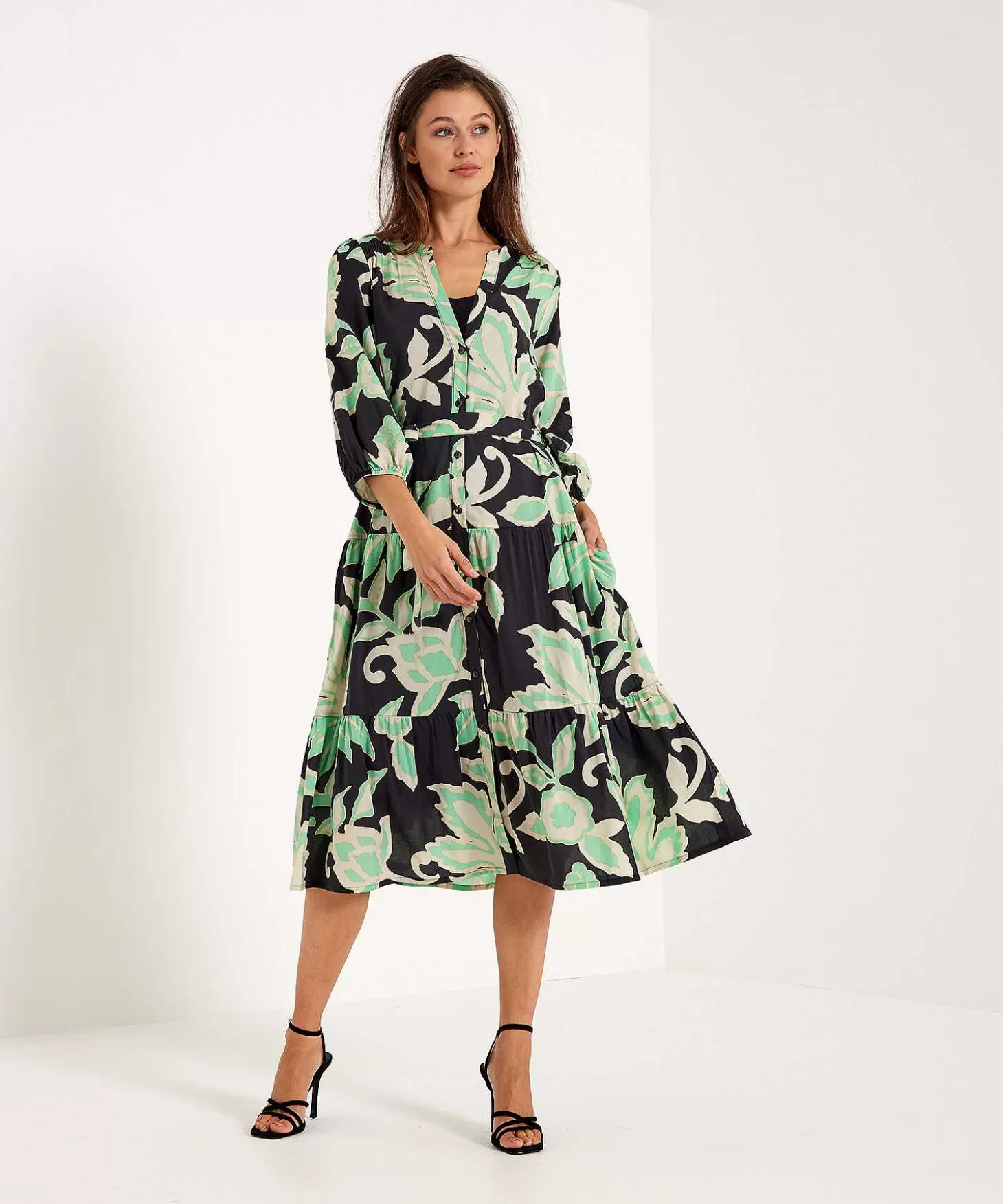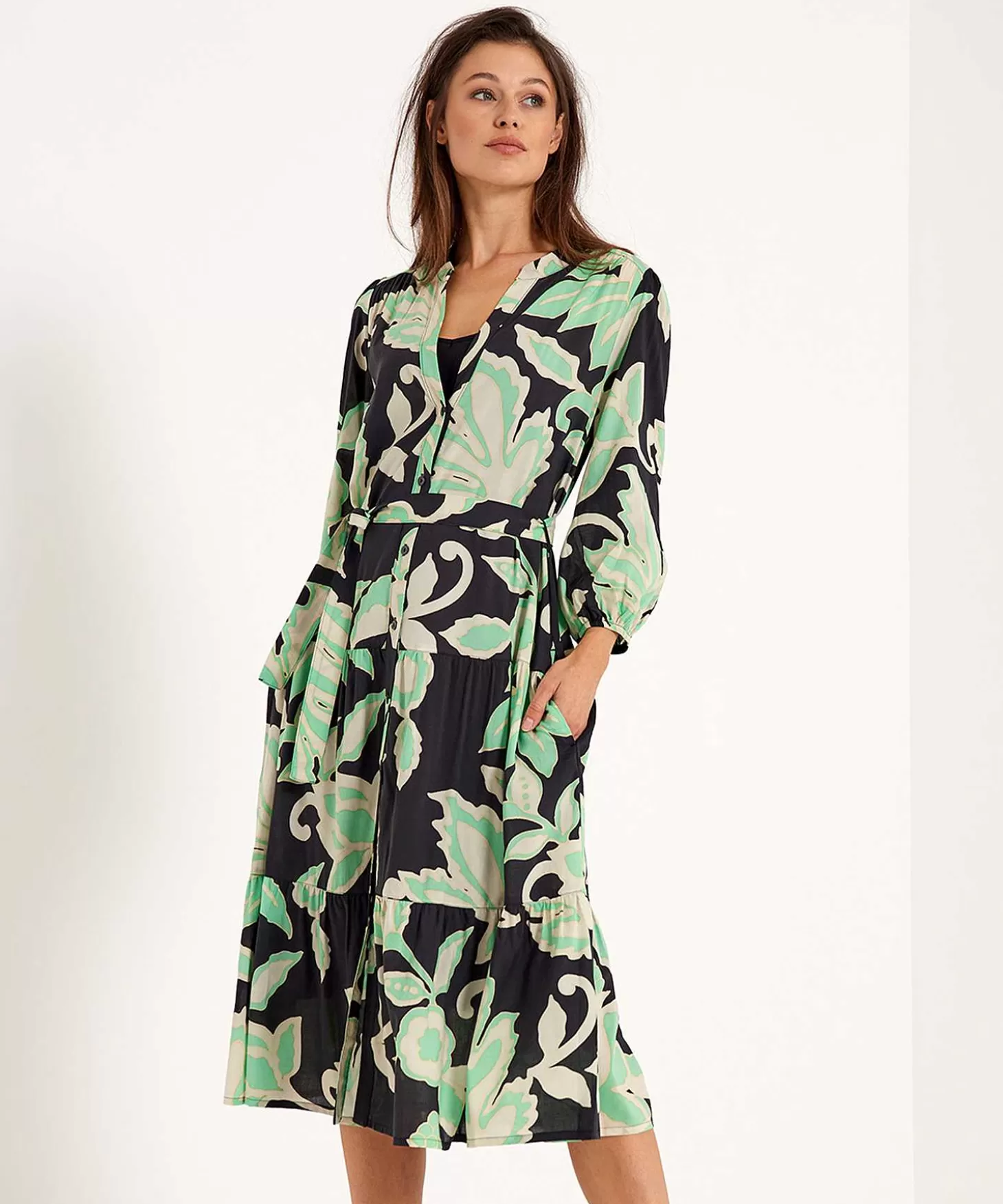 Pick Some Flowers Met Deze Summum Jurk Met Botanische Print. Zie Je Haar Bladeren & Bloemen En Haar Vergrijsde Kleurpalet In Offwhite, Zand, Mint En Zwart? Gevoerd Met Een Zwarte (Losse) Onderjurk Geef Je Nooit Te Veel Prijs. Dankzij Haar Tuniekhals Met Knoopsluiting, Losse Model Met Feminien Strikceintuur (Afneembaar) En Uitlopende Strokenrok Draagt Ze Heerlijk Op Zonnige Dagen. Voel Je Haar Dunne Luchtige Katoenmix En Zie Je Haar Verborgen Steekzakjes, 3/4E Pofmouw En Lengte Tot Over De Knie? Je Draagt Haar Met Alle Soorten Schoentjes En Ze Geeft Elke Dag Botanical Vibes. Met Onderjurk. Samenstelling: 52% Katoen, 48% Viscose. Onderjurk: 100% Viscose.