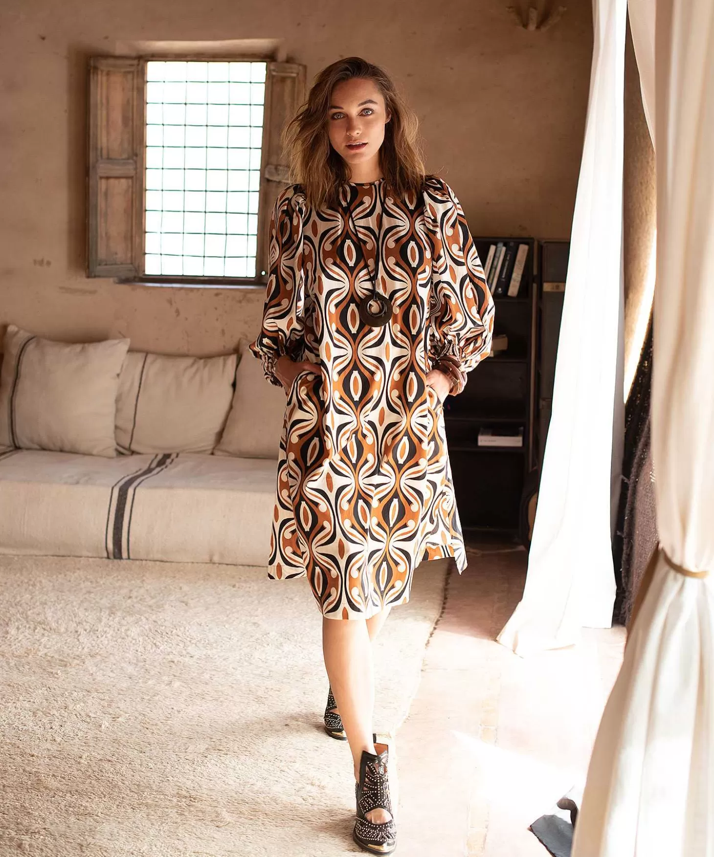 Meet The 60’S Met Deze Summum Jurk In Maxi Ornamentprint. Wat Een Retro-Beauty Met Haar Sprekende Patroon In Offwhite, Camel (Caramel) En Zwart En Zie Je Haar Minimalistische Model? Met Haar Ronde Hals, 3/4E Pofmouw Met Elastisch Manchet, Zwierig Uitlopende A-Lijn En (Losse) Strikceintuur Is Ze Super Feminien & Stoer Tegelijk. Draag Haar Losjes Met Laarzen Of Sneakers Op Fashionable Stedentrip. Voor Een Artistieke Of Feestelijke Look Snoer Je Je Taille In (Kan Ook Met Een Vegan Leren Ceintuur) En Combineer Je Haar Met High Heels Of Loafers. Ben Jij Al Onder De Indruk? Exclusief Witte Riem, Inclusief Ceintuur Van Stof. Samenstelling: 100% Katoen.