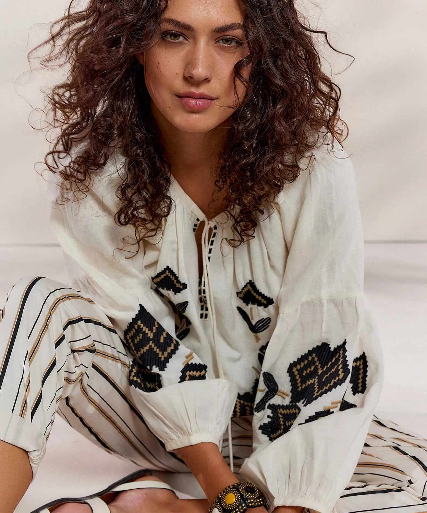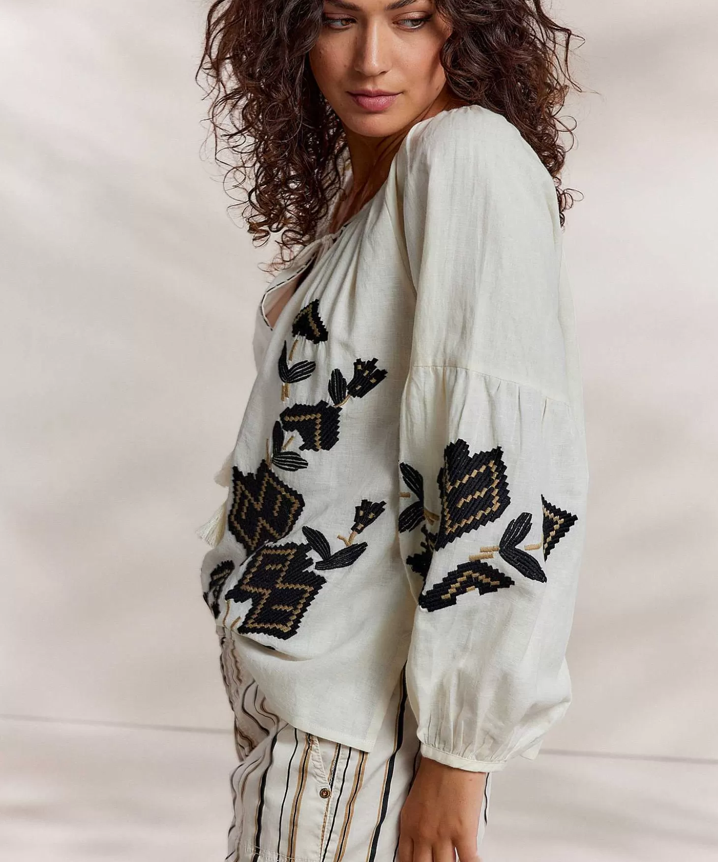 In Stevige Linnenmix Met Robuust Borduursel Is Deze Summum Blouse Klaar Voor Mooi Weer. Wat Een Feminien En Tegelijk Stoere Blouse Met Haar Contrastrijke Embroidery In Zwart/Zand Op Offwhite Katoen/Linnen Naast Een Luchtige Tunieksluiting Met Strikveters + Kwastjes Heeft Ze Een Losse A-Lijn En Royale Ballonmouwen. Je Draagt Deze Beauty Met Een Linnen Broek, Palazzo. Jeans Of Denim Rok + Loafers, Sandaaltjes, Laarsjes Of Sneakers. Laat De Zomer Maar Komen. Samenstelling: 60% Katoen, 40% Linnen.