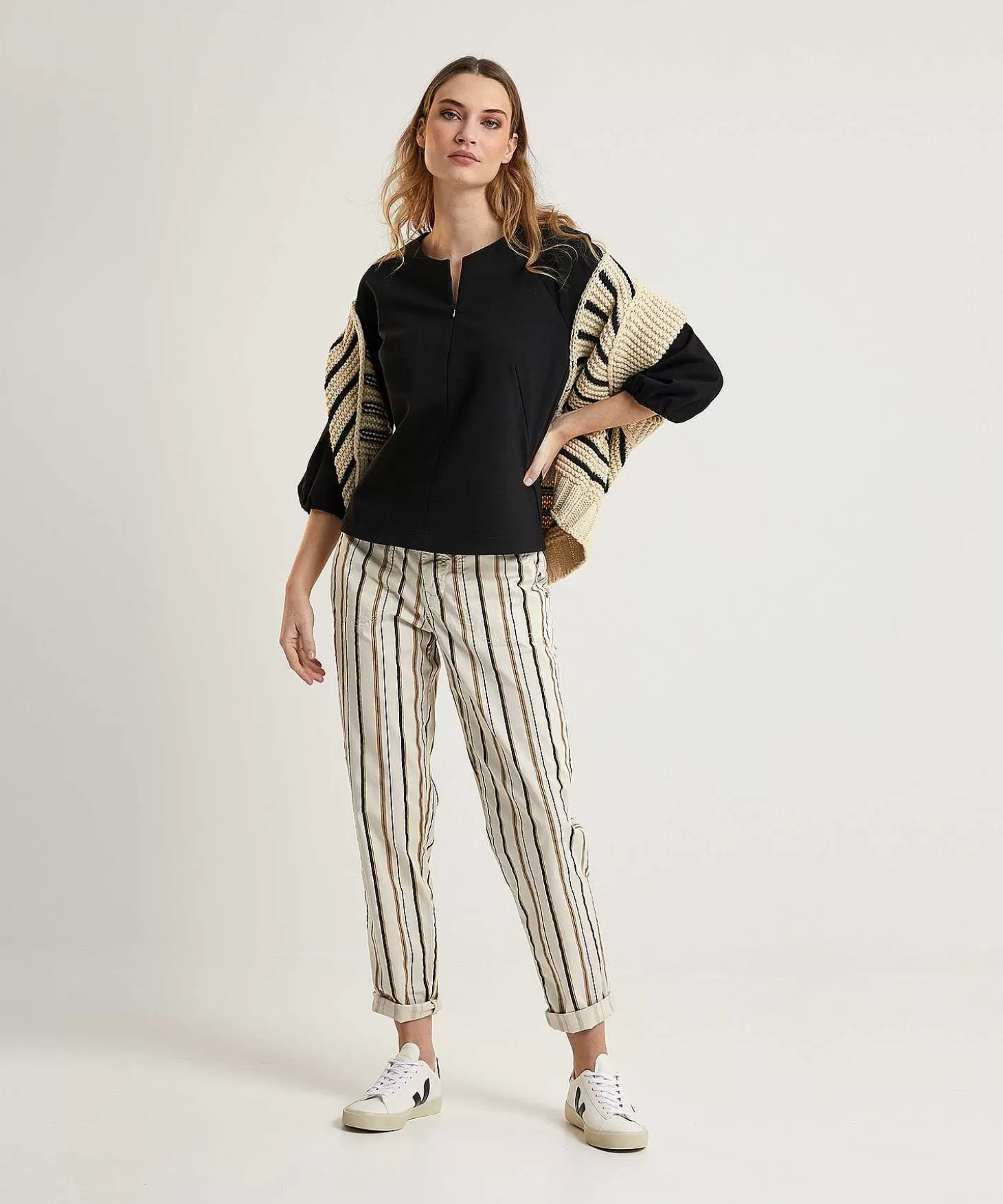 In Loose Fit En Met Maritieme Strepen Is Deze Summum Broek Ready For Spring & Summer. Zie Je Haar Speelse Streeppatroon In Licht En Donker Zand + Zwart Op Zanderig Offwhite En Waardeer Je Haar Relaxte En Losse Pasvorm? Je Draagt Deze Luchtige Broek Met Knitwear, Een Blouse, Sweater Of T-Shirt Met Sneakers, Loafers Of Boots, Want Ze Voelt Zich Als Een Vis In Het Water In Jouw Garderobe. Zit Je Tussen 2 Maten In, Neem Gerust De Kleinere Maat. Samenstelling: 97% Katoen, 3% Elastan.
