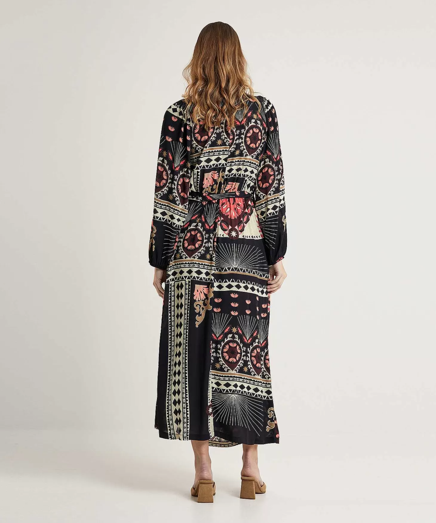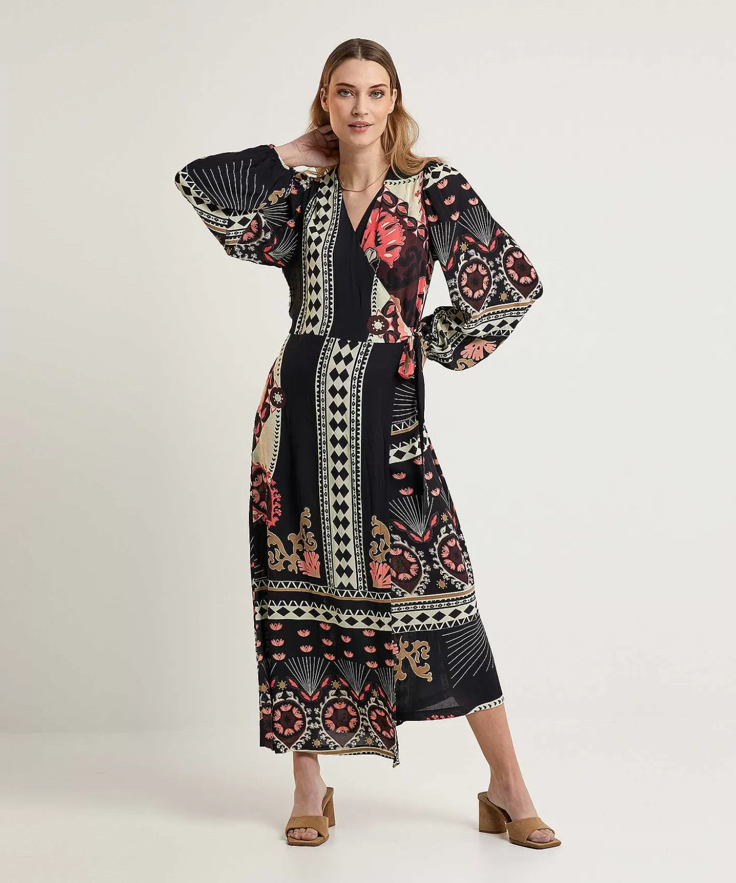 Deze Summum Jurk In Maxi Overslagmodel Combineert Luchtige Crêpe Met Een Speelse Multiprint. Geïnspireerd Op Een ‘Scarfprint’ In Neutrale Kleuren Als Offwhite, Donkerzand, Licht En Donker Koraal En Zwart Past Dit Relaxte Model Bij Veel Accessoires Uit Jouw Kledingkast. Deze Jurk Accentueert Je Taille Met De Striklinten En Heeft Een Diepe V-Hals Met Overslag, Verborgen Zakjes En Lange Ballonmouwen Met Elastisch Manchet. Flaneren En Stijlvol Je Benen Tonen Was Zelden Zo Eenvoudig. Je Draagt Dit Ultieme Zomerse Model Met Loafers, Sandaaltjes, Sneakers Of High Heels En Je Draagt Haar Met Gemak De Seizoenen Door. Samenstelling: 100% Viscose.