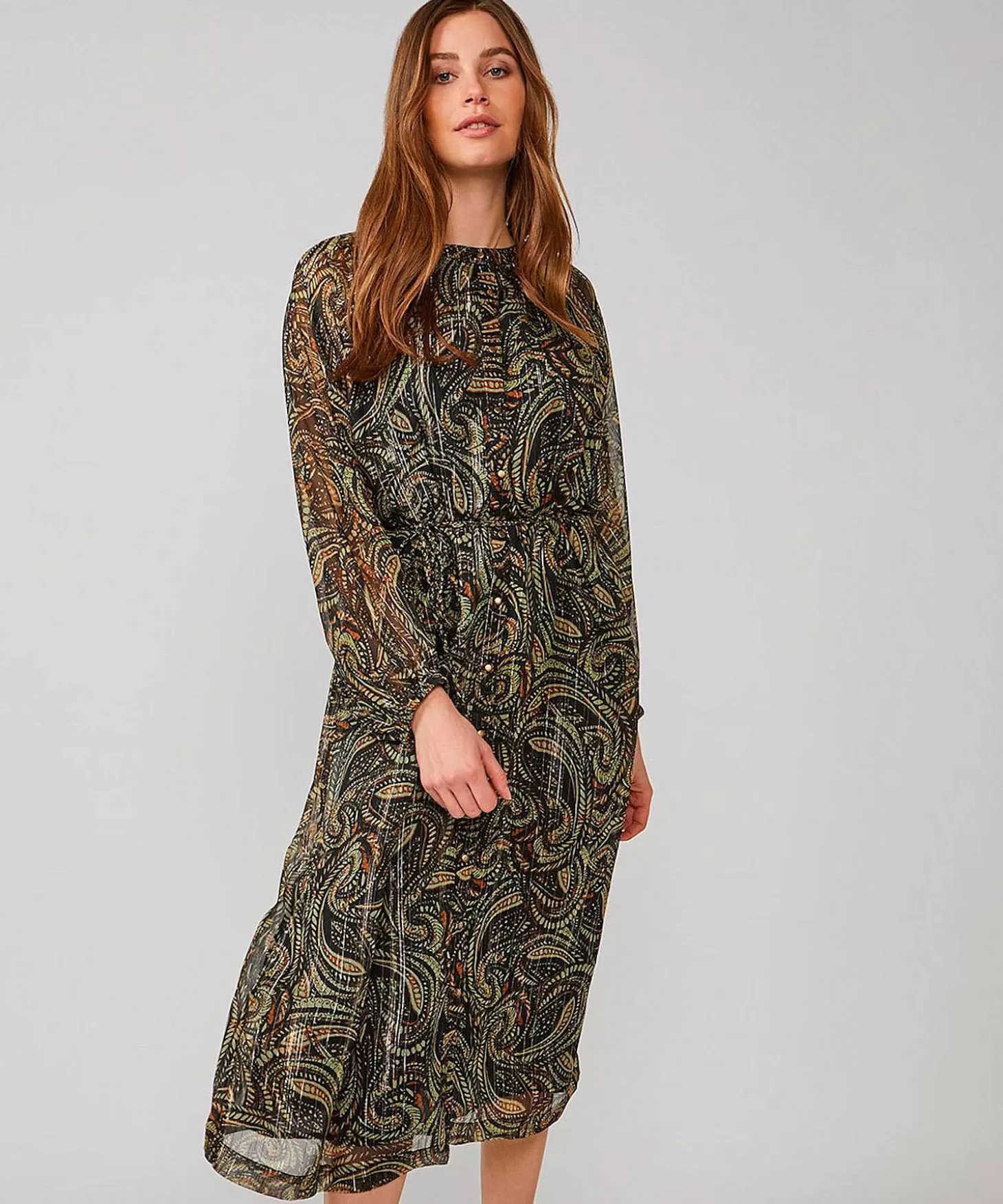 Deze Vrolijke Midi-Jurk Met Swirlprint En Subtiele Gouden Details Van Summum Zet Jou Geheid In De Spotlight. Het Gladde Materiaal Is Gevoerd En Valt Soepel Langs Het Lichaam. Dankzij De Ruches Aan Het Uiteinde Van De Mouwen Geeft Het Een Poffend, Speels Effect. Er Loopt Een Matte Knopenrij Over De Gehele Lengte Van De Jurk, Creëer Jouw Mooiste Taille Met Het Dunne Ceintuur. Combitip: Draag Er Eens Een (Matcha Groene) Wollen Trui Overheen. Maar Ook Tijdens Een Feestje Komt De Jurk Totaal Tot Zijn Recht, Vanwege De Mooie Stijlvolle Kleuren En Gouden Lurexdraadje! Samenstelling: 90% Polyester, 10% Lurex.