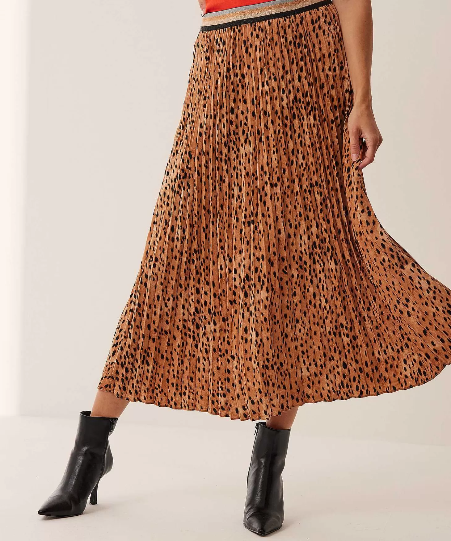 Cheetah Meets Summum Met Deze Plissérok In Verfijnde Animalprint. Vanuit De Elastische Tailleband Met Lurex Strepen Valt Deze Rok Soepel Naar Beneden In Plissé. Met Haar Vergrijsde Mandarin In Donkere En Lichte Tinten Met Zwarte Dots Is Dit Rokje Allround En Je Combineert Haar Met Veel. Draag Haar Met Een Colshirt, Blouse Of Korte Knitwear + Laarzen, Loafers, Sneakers Of High Heels En Je Bent Altijd ‘Spot On’. Samenstelling: 100% Polyester.