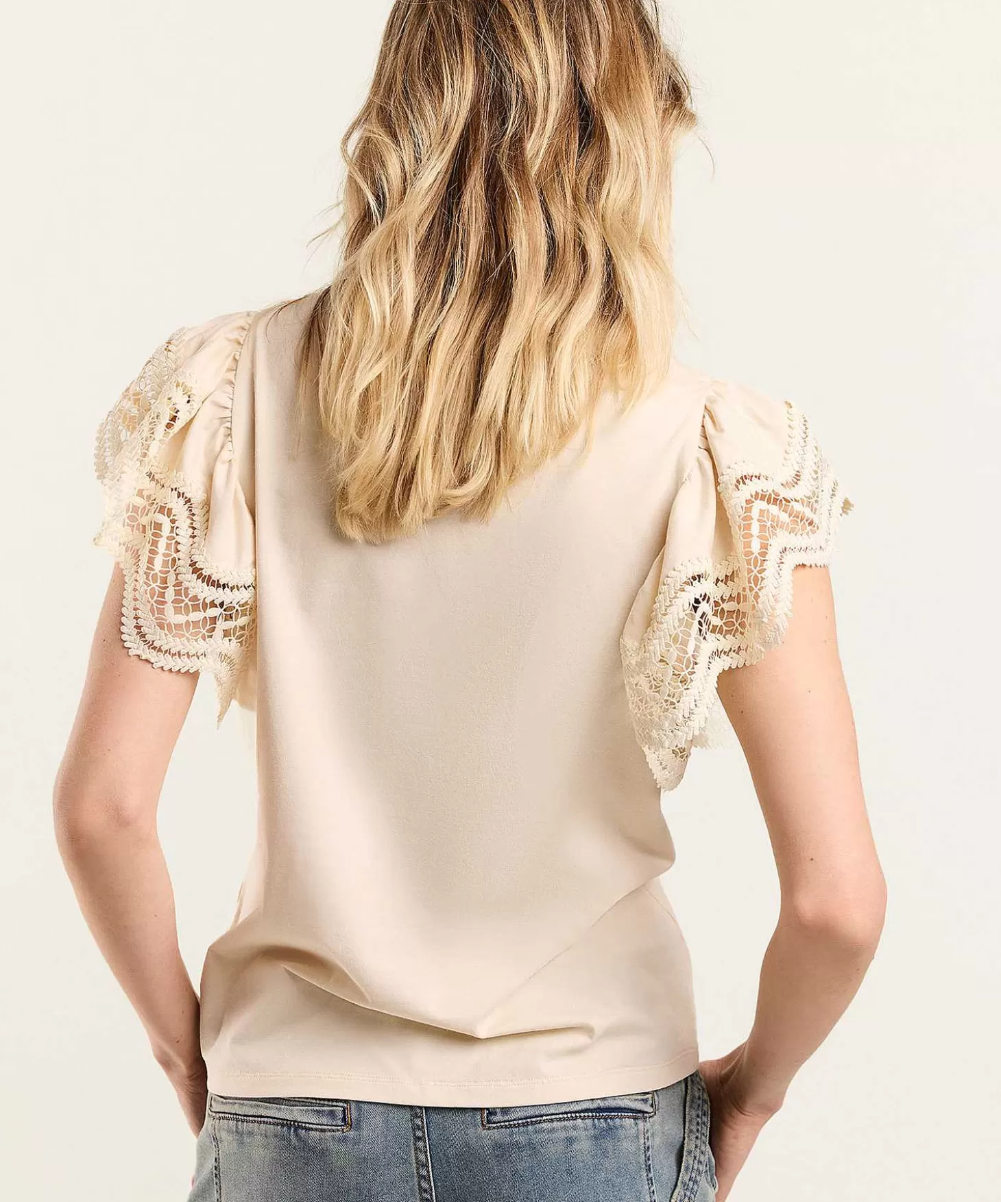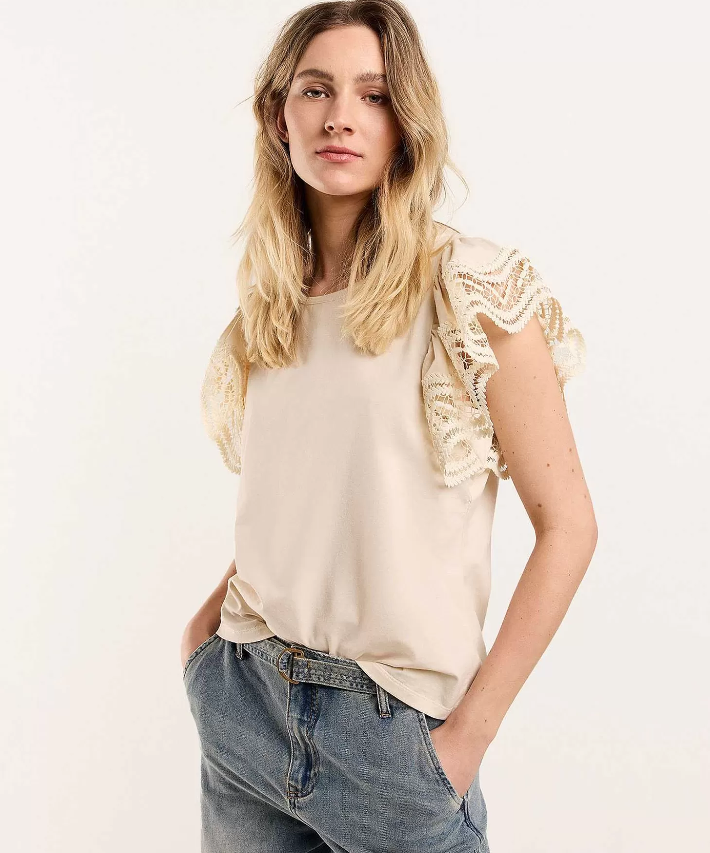 Met Haar Kanten Volants Mouw Is Deze Summum Top Summerchic. Wat Een Beauty Met Haar Ronde Hals, Relaxte Fit En Zomerse Ecru Kleur En Voel Je Haar Aangename Katoen? Het Chique Kanten Mouwtje Valt Als Een Waterval Over Je Schouder En Dit Shirt Heeft Een Losse Pasvorm.