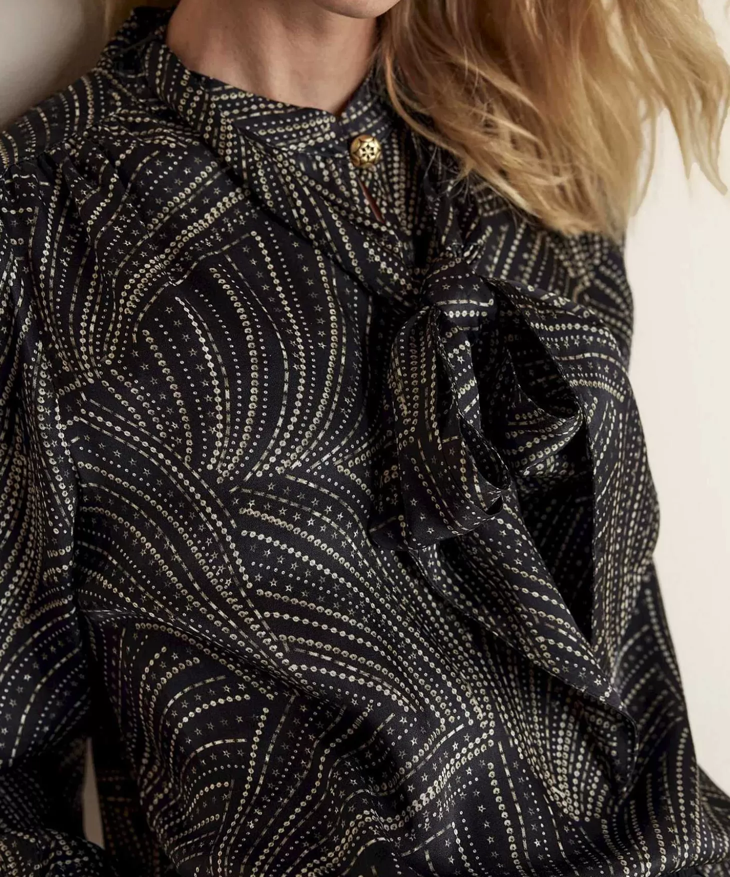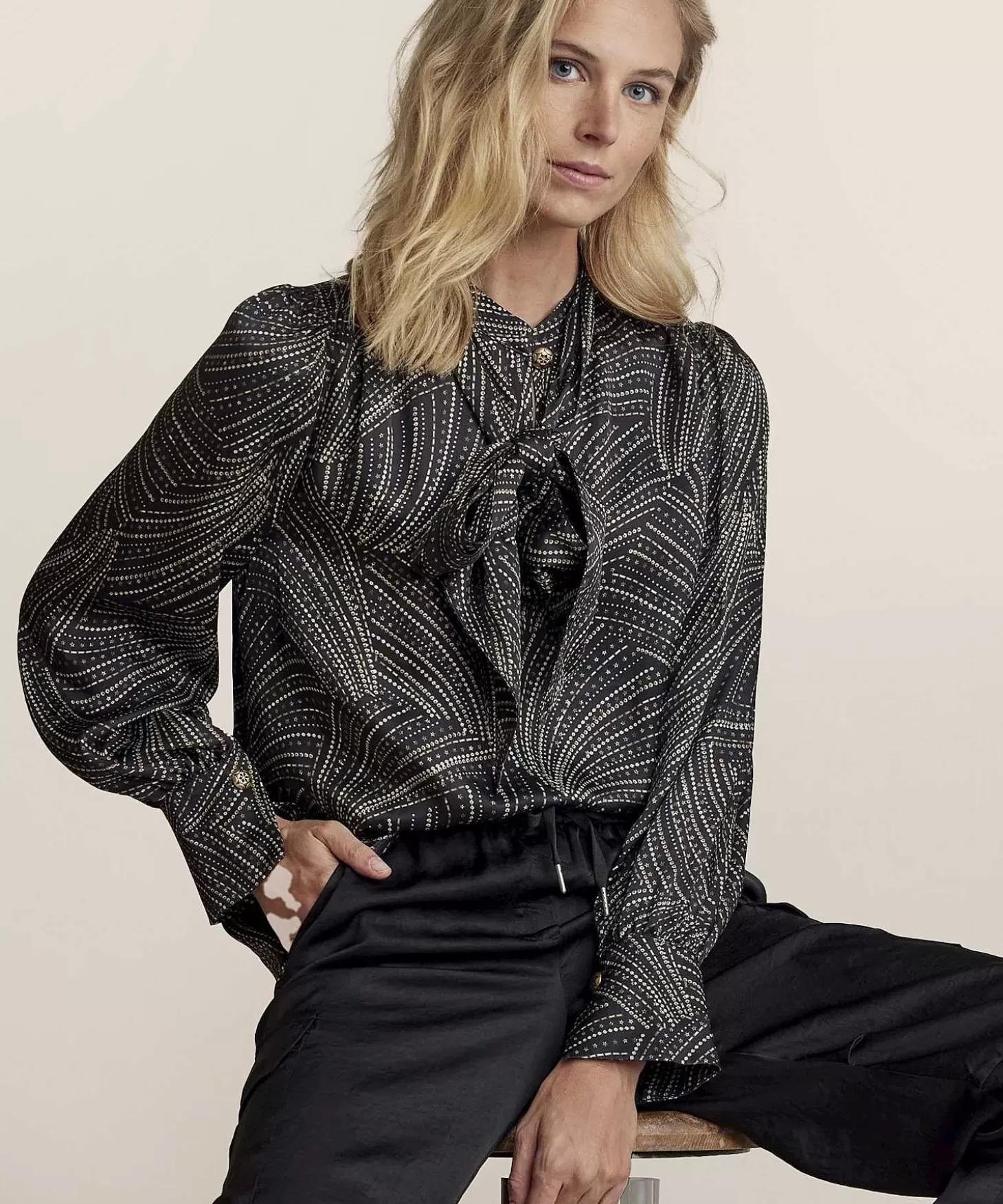 Zijdezachte Blouse Met Glanzende Satijn Feeling En Glans. Summum Voegt Een Feestelijke Blouse Toe, Die Ook Geschikt Is Voor Iedere Dag. Het Is Maar Net Hoe Je Haar Combineert. De Zachte Glanzende Stof Heeft Een Print Van Sterretjes En Stippen In Een Gedraaid Patroon. Het Model Van De Blouse Is Rechtvallend Met Grote Ballonmouwen Met Brede Manchetten En Een Goudkleurige Knoop. De Aandacht Wordt Getrokken Door De Rechtopstaande Kraag Met Goudkleurige Knoop En De Brede Satijnen Linten Voor Een Strik In De Hals. Combineer Op Je Jeans Of Ga Voor Een Feestelijke Rok Of Wideleg Pantalon Met Hak. Samenstelling: 100% Viscose.