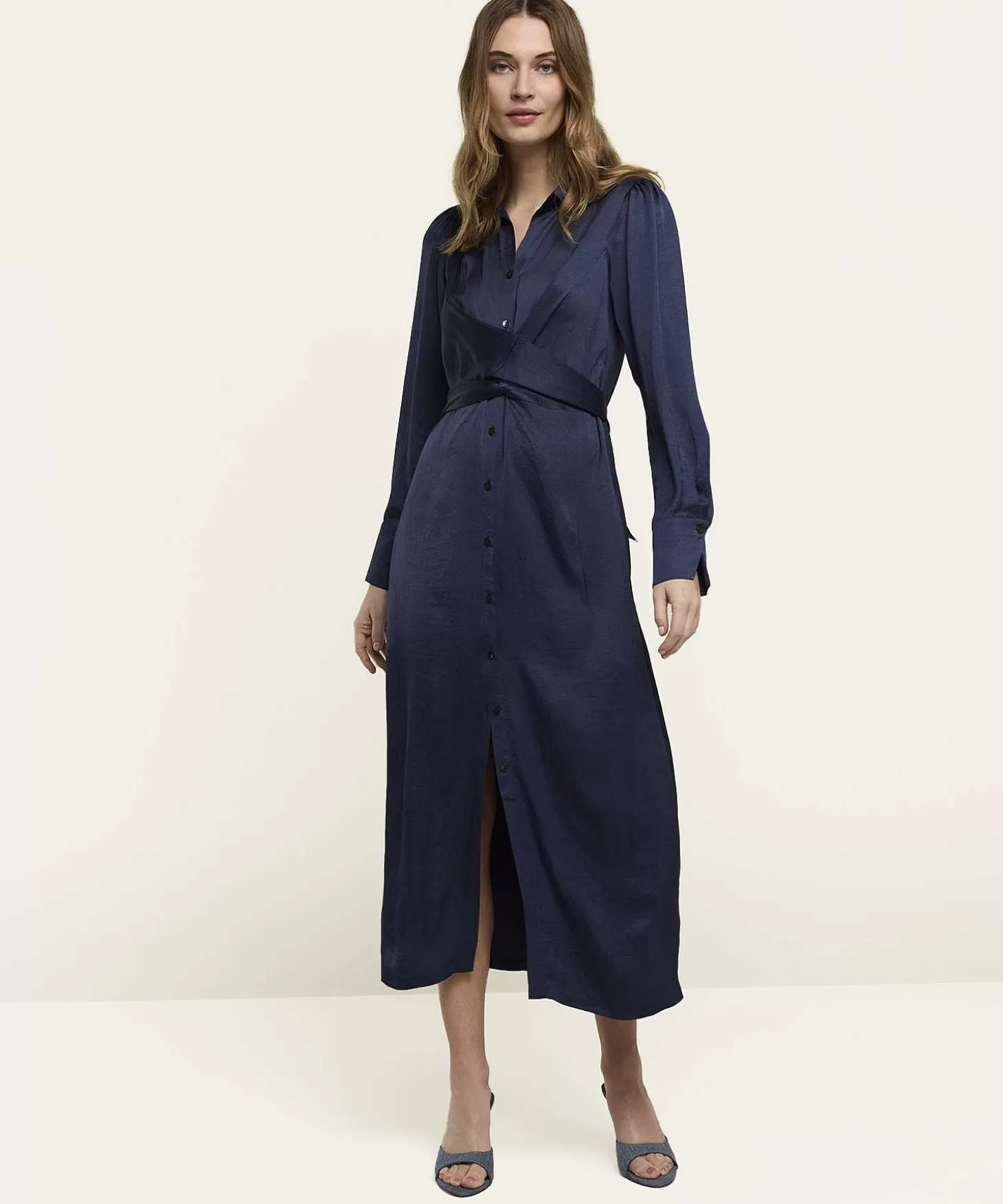 Deze Silky Summum Jurk Biedt Two Ways To Wear!. Zie Je Haar Speels Verwerkte Brede Strikceintuur Vanuit De Taille? Je Strikt Haar Niet Alleen Middenvoor, Maar Je Kunt Haar Ook Kruislings Naar Achter Vouwen En Op Je Rug Strikken. Welke Draagwijze Kies Jij? In Nachtblauw Satijn Wil Deze Feestelijke Jurk Direct Met Jou Op Stap En Haar Maxi-Lengte, Doorknoopmodel En Lange Pofmouw Maken Haar De Perfecte 4-Seizoenen Jurk. Je Draagt Haar Nu Al Met Een Giletje, Vestje Of Blazer + Laarsjes, Loafers Of High Heels. Als Het Warmer Wordt Combineer Je Haar Met Een Sandaaltje Of Sneaker En Een Uni (Of Gestreept) Singlet. Samenstelling: 100% Acetaat.