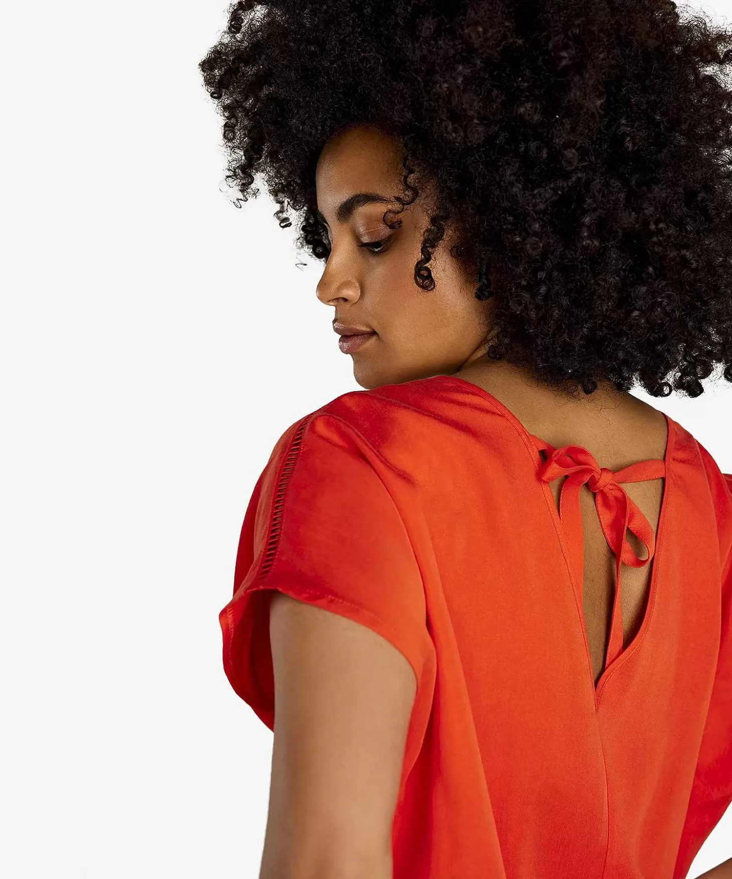 Deze Summum Top Ademt Op En Top Zomer. Wat Een Luchtig En Los Model Met Haar Geraffineerde Knoopdetail Aan De Zoom, V-Hals Voor En Achter Met Striklinten. Zie Je Haar Opengewerkte Bandje Langs De Schouder En Voel Je Haar Streelzachte Tencel? Uit De Green Collectie Is Ze Nog Duurzaam Ook En Ze Past Bij Veel Uit Jouw Garderobe. Je Draagt Haar Met De Summum Wide Leg Broek + Sandaaltjes Voor Een Overall Ravissante En Feestelijke Look, Maar Ook Met Een Jeans En Sneakers Ben Je Picture Perfect Onderweg. Verkrijgbaar In Zand, Mandarin, Oceaanblauw En Zwart Is Er Altijd Een Kleurtje Naar Jouw Hart. Samenstelling: 100% Tencel.