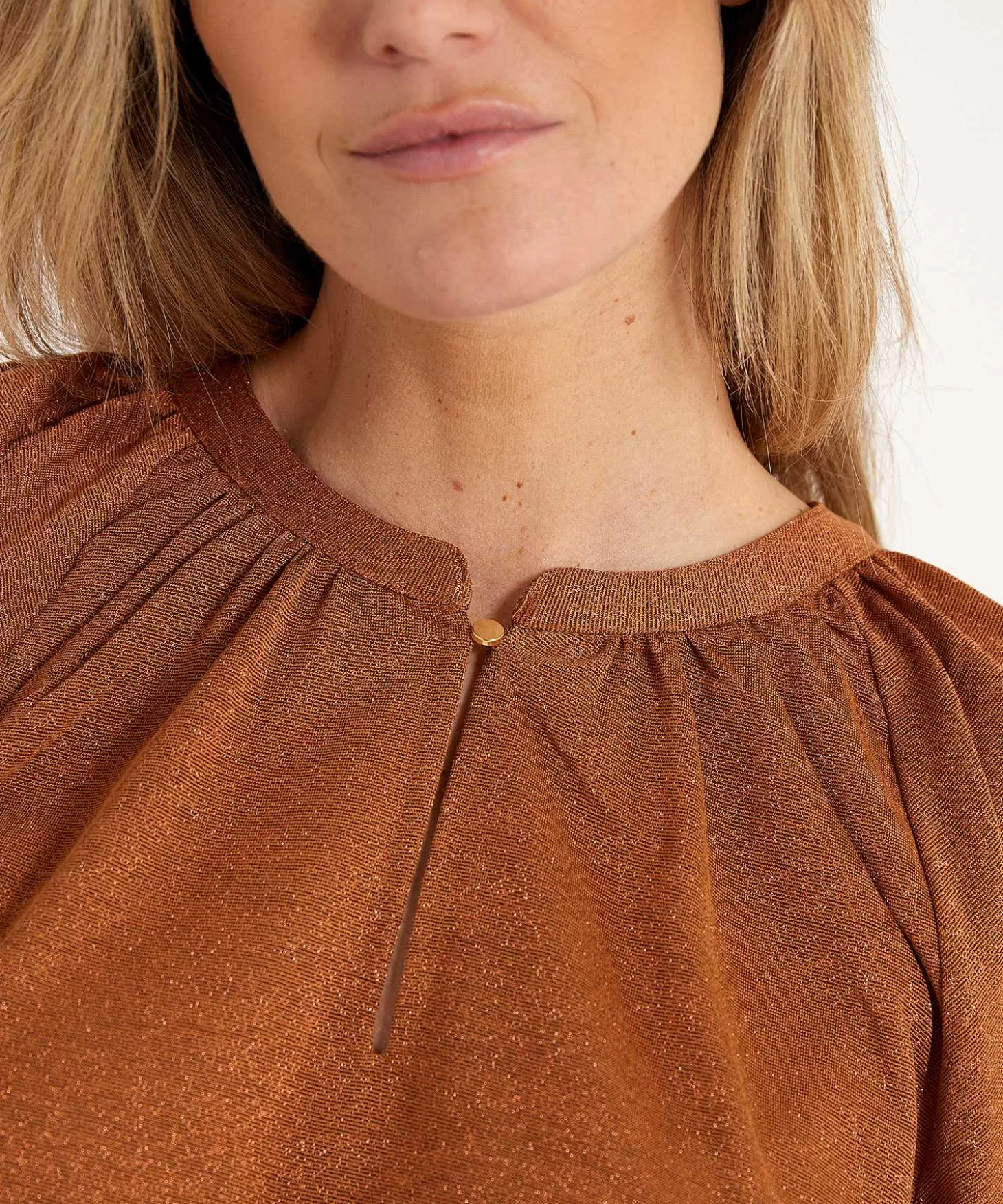 Vlinder De Zon Tegemoet Met Deze Lurex Summum Top Met Korte Vlindermouw. Wat Een Sprankelende Cognac Kleur En Wat Een Feminien Model Met Haar Key-Holesluiting, Smalle Halsje Met Plooitjes En Uitwaaierend Raglanmouwtje. Krijg Jij Al Zin In De Zomer? Je Draagt Haar Met Een Pantalon Of Printbroek Met Loafers Of High Heels Naar Een Feestje Of Je Werk (+ Een Blazer). Op Stedentrip Draag Je Haar Met Een Oversized Vestje, Een Jeans En Sneakers Voor Een Klassiek Sportief Stijltje. Sparkle & Shine Met Summum! Samenstelling: 70% Viscose, 30% Metaalgaren.