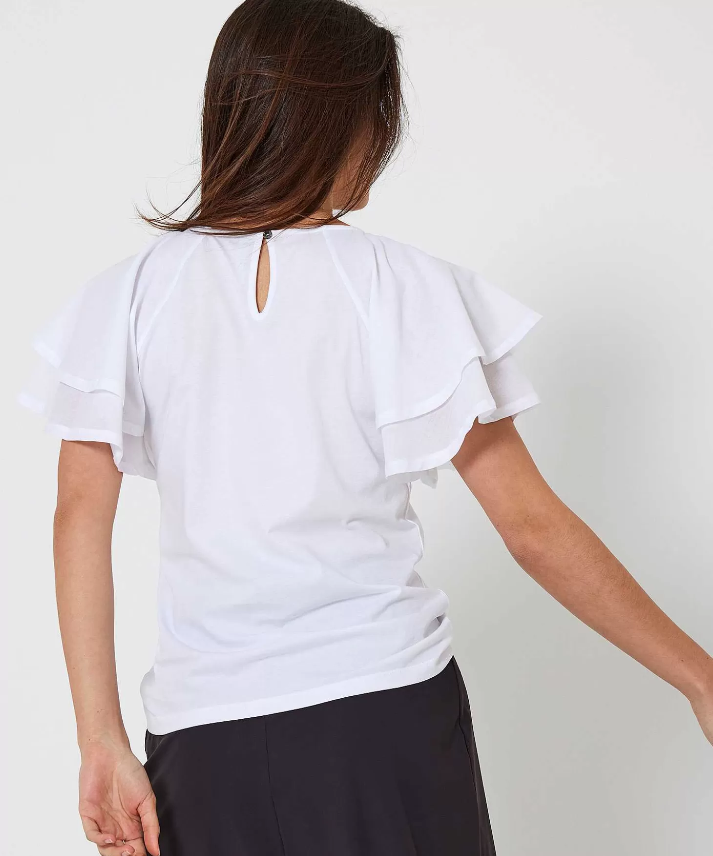 Waan Je Een Spaanse Schone Met Dit Summum Shirt Met Dubbele Vlindermouw. We Love Ruffles & Summum! In Stevige Witte Of Zwarte Tricot Met Fijne Stretch Valt Dit Shirt Losjes Maar Very Feminine En Je Draagt Haar Met Veel. Op Een Feestje Match Je Haar Met Een Maxi-Printrok En Laarsjes + Rinkelende Sieraden Voor Een Boho Look En Op Citytrip Draag Je Haar Met Een Jeans En Sneakers Voor Een Klassiek Sportief Stijltje. Met Een Pantalon In Een Pittige Trendkleur + Loafers Creëer Je Een Pittige Look, Ben Jij Al Verkocht? Samenstelling: 100% Katoen.