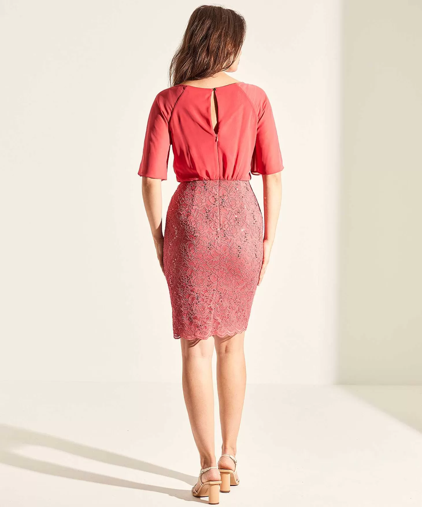 Voile & Kant Gaan Hand In Hand Met Deze Swing Jurk. Wat Een Spetterend Model Met Haar Luchtige En Losse Top In Voile Met V-Hals, Kort Uitlopend Mouwtje En Aansluitende Kokerrok In Stretchy Kant Mét Sparkling Pailletten. Knielang, Elegant En In De Mooiste Koraaltint (Of Chique Nachtblauw) Ga Jij Absoluut Shinen In Deze Zandloperjurk. Eyecatchers Zijn Het Contrast Tussen De Top En De Rok, De Keyhole-Sluiting Achter, Het Sprankelende Kant En De Geschulpte Zoom Die Je Kuiten Omlijst. Dit Jurkje Is Jersey Gevoerd. Samenstelling: 97% Polyester, 3% Elastan. Kantstof: 100% Polyester. Onderjurk/Voering: 92% Polyester, 8% Elastan.