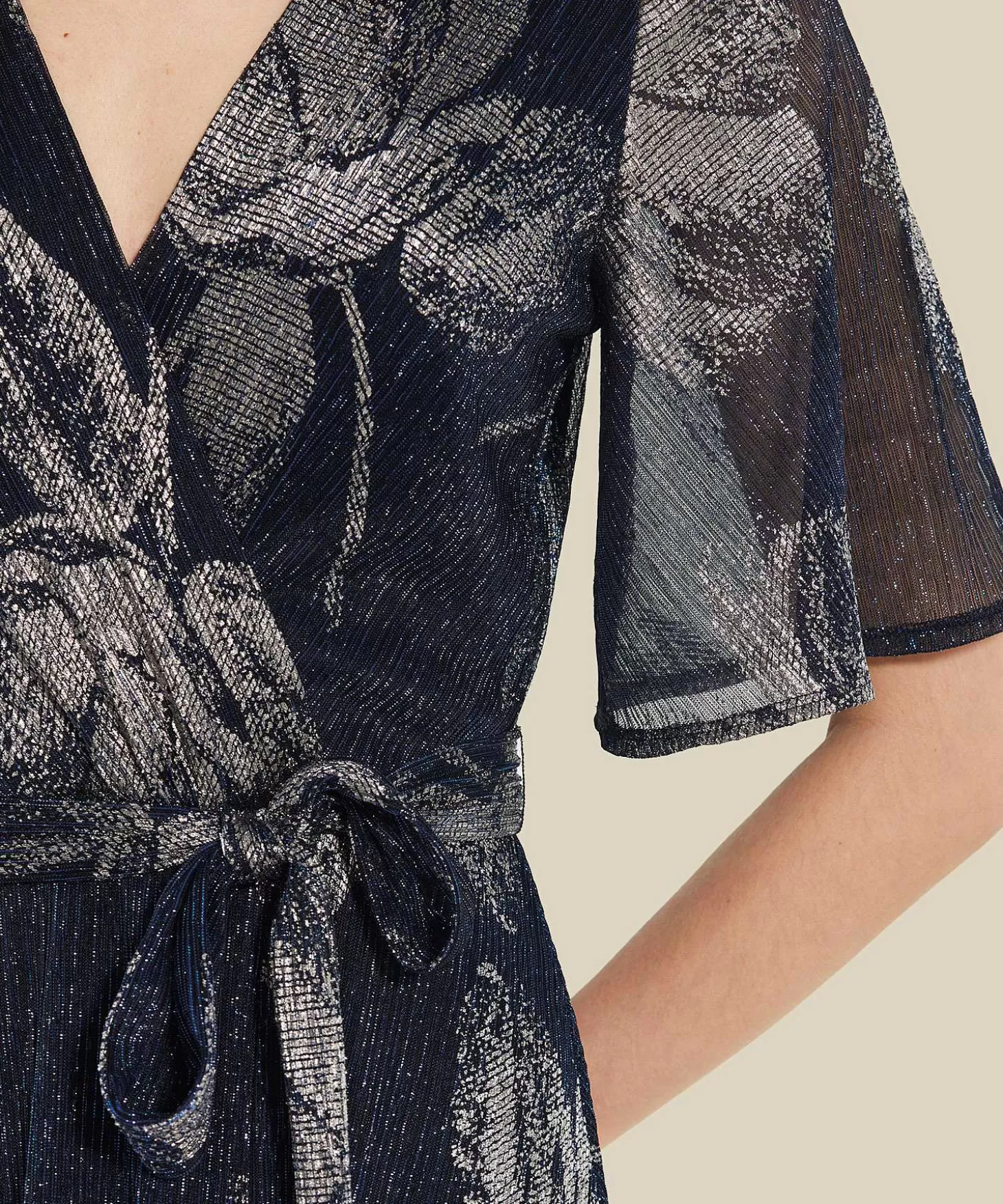 Sparkling Flowers Met Deze Swing Overslag Jurk In Lurex Streepje. Deze Feestjurk Heeft Alles In Huis Voor Een Spetterende Party. Zie Je Haar Vaste Overslag, Uitlopende Korte Mouw, Striklinten Voor Een Geaccentueerde Taille En Uitwaaierende Rok? Vanaf De Nachtblauwe Basis Poppen Zilveren Pioenrozen Op Naast Fijne Lurex Streepjes In Blauw En Paars. Dit Knielange Juweel Van Een Jurk Sluit Achter Met Een Blinde Rits En Het Lijfje En Rok Zijn Jersey Gevoerd. Je Draagt Haar Met High Heels, Flats Of Een Comfortabele Sleehak En Ze Verveelt Nooit. Let’S Get This Party Started! Samenstelling: 55% Polyester, 45% Metaalgaren. Voering: 92% Polyester, 8% Elastan.