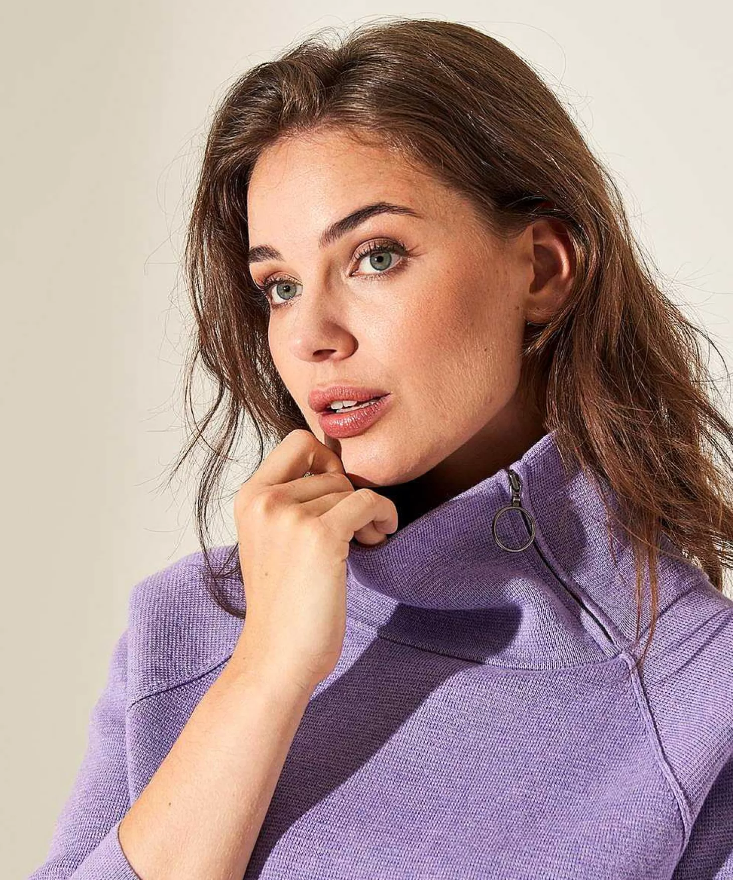 In Stevige Punta Knit Houdt Deze Trui Je Overal Behaaglijk Warm. In Gemêleerde Zandkleur Of Lila En Met Een Opvallende Goudkleurige Asymmetrische Zipper Met Keyring Rits Je Haar Opstaande Kraag Speels Open Of Dicht. Voel Je Haar Stevige Maar Soepele Punta Knit (Speciaal Breisel Met Gladde Afwerking Aan De Zoom) En Zie Je Haar Sportieve Raglanmouw En Zijsplitjes? Je Draagt Dit Rechte Model Met Een Jeans En Sneakers Op Sportieve Avonturen. Maar Ook Met Een Printbroek En Loafers Of Een Maxi-Rok + Laarsjes Creëer Je Een Stijlvolle ‘Everyday Look’. Samenstelling: 100% Katoen.