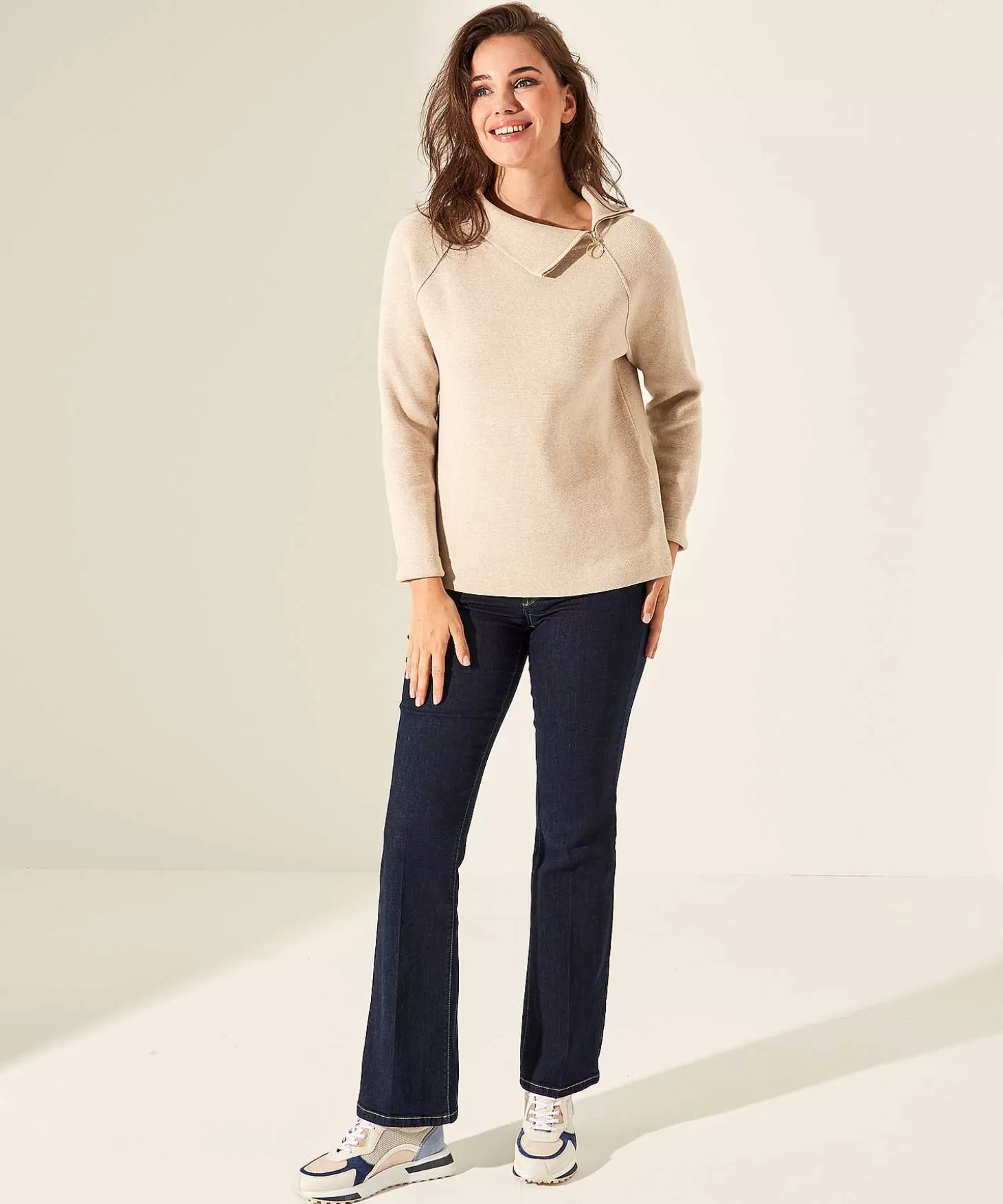 In Stevige Punta Knit Houdt Deze Trui Je Overal Behaaglijk Warm. In Gemêleerde Zandkleur Of Lila En Met Een Opvallende Goudkleurige Asymmetrische Zipper Met Keyring Rits Je Haar Opstaande Kraag Speels Open Of Dicht. Voel Je Haar Stevige Maar Soepele Punta Knit (Speciaal Breisel Met Gladde Afwerking Aan De Zoom) En Zie Je Haar Sportieve Raglanmouw En Zijsplitjes? Je Draagt Dit Rechte Model Met Een Jeans En Sneakers Op Sportieve Avonturen. Maar Ook Met Een Printbroek En Loafers Of Een Maxi-Rok + Laarsjes Creëer Je Een Stijlvolle ‘Everyday Look’. Samenstelling: 100% Katoen.
