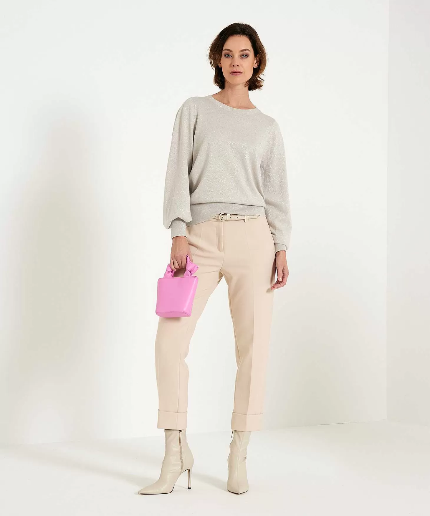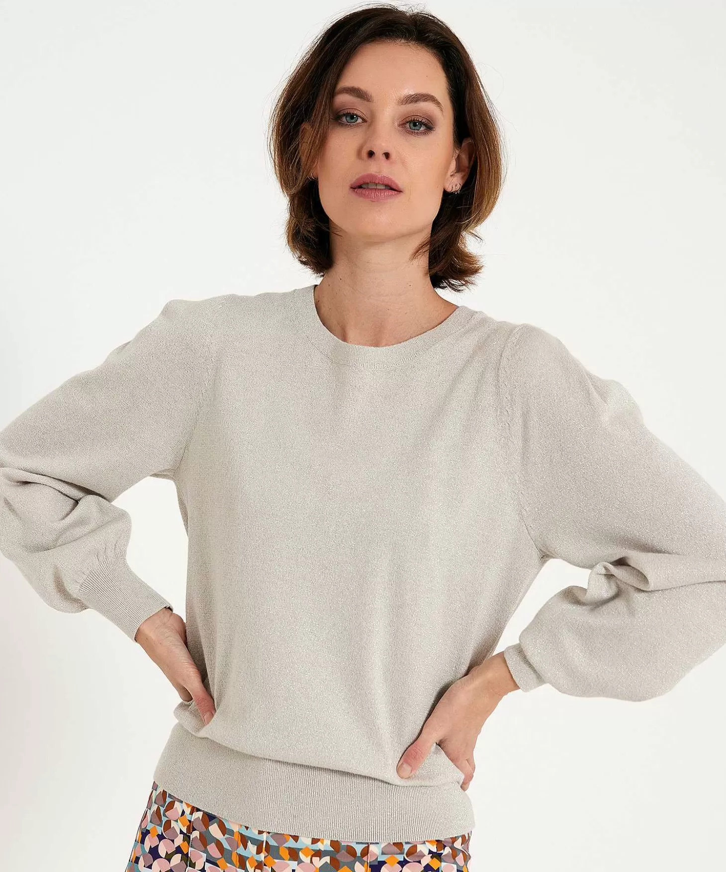 Sparkle & Shine Met Deze Trui In Sprankelende Lurex Met Een Toefje Zijde. Zie Je Haar Neutrale Allround Kiezelkleur, Ronde Hals En Feminien Ballonmouw Met Slanke Boorden? Deze Alleskunner Geeft Iedere Outfit Klasse En Pit. Match Haar Met Een Jeans En Boots Op Citytrip Of Naar Kantoor Of Feestje Straal Jij Samen Met Een Pantalon En High Heels. We Love A Splash Of Lurex! Samenstelling: 64% Katoen, 21% Polyamide, 8% Zijde, 7% Metallic.