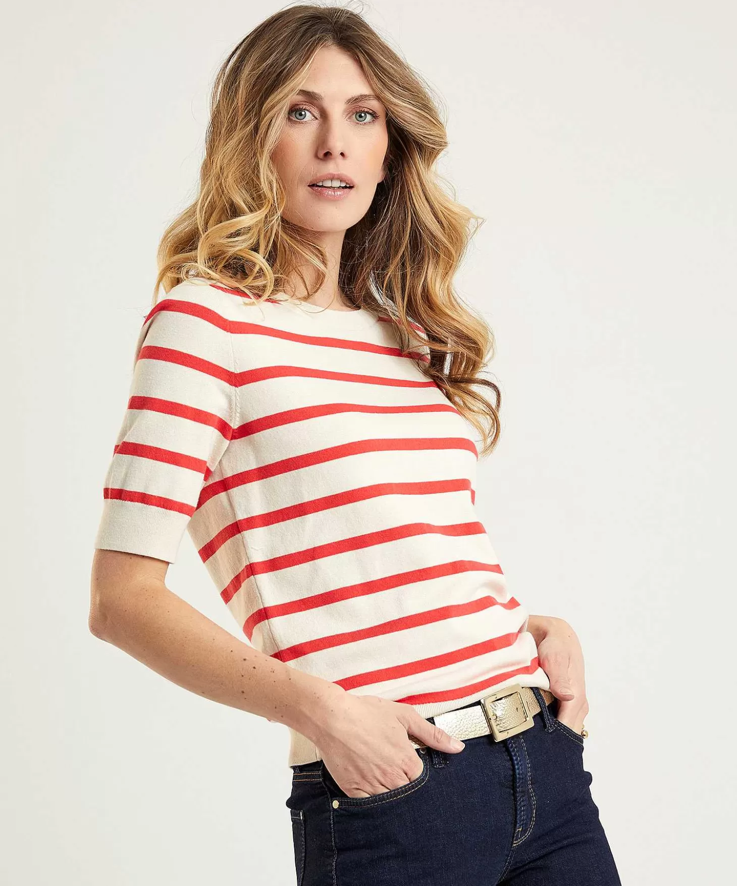 Met HetTruitje Met Korte Mouw En Strepen Geef Je Elke Outfit A Fresh Start. Zie Je Haar Kleurpalet In Offwhite/Koraal, …