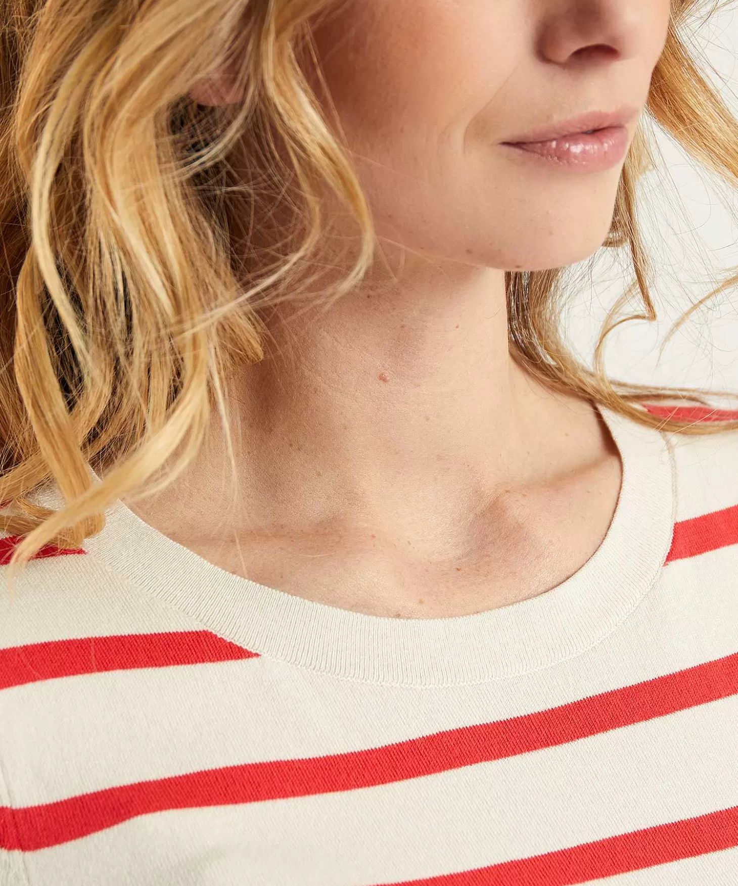 Met Het Truitje Met Korte Mouw En Strepen Geef Je Elke Outfit A Fresh Start. Zie Je Haar Kleurpalet In Offwhite/Koraal, Kiezel/Marine, Offwhite/Oceaan Of Wit/Olijf En Voel Je Haar Zachte Breisel In Aangename Katoenmix? Dit Is Zo’N Model Dat Perfect Onder Een Blazer Of Jasje Past, Maar Als Haar Fraaie Zelf Ook Prachtig Is. Combineer Haar Met Een Blazer, Pantalon En Loafers Voor Naar Je Werk Of Een Feestje. Tijdens Het Shoppen Draag Je Haar Met Een Denimjasje, Een Jeans En Sneakers. Maar Ook Met Een Vegan Leren Broek En High Heels Ben Je Absoluut Partyproof. Samenstelling: 80% Katoen, 17% Polyamide, 3% Elastan.