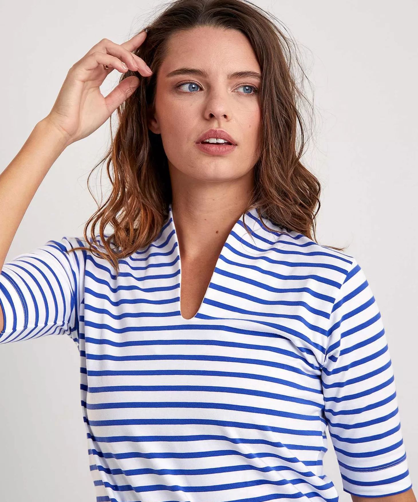 Met Een Hals Als Een Elegant Tulpenblaadje Is Het Tulpshirt Een Ware Beauty. Zie Je Haar Elegante Opstaande Halslijn Met V-Hals, Korte Mouw En Tijdloze Bretonse Streep? In 5 Verschillende Kleurcombinaties Is Er Altijd Een Streepshirt Naar Jouw Garderobe En Ze Geeft Elke Outfit Sporty & Classy Vibes. Met Haar Stretchy Materiaal En Relaxt Aansluitende Pasvorm Voegt Ze Zich Perfect Onder Een Blazer, Vest Of Denim Jasje En Wat Dacht Je Van Gewoon Als Haar Fraaie Zelf? Je Combineert Haar Met Een Jeans, Denim Rok, Wide Leg Broek Of Cargo + Sneakers, Loafers, Laarsjes Of High Heels. Samenstelling: 95% Katoen, 5% Elastan.